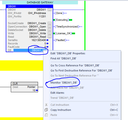 5. Goto your DBGW Add-On instruction and right click on DB tagname, and select “Monitor”